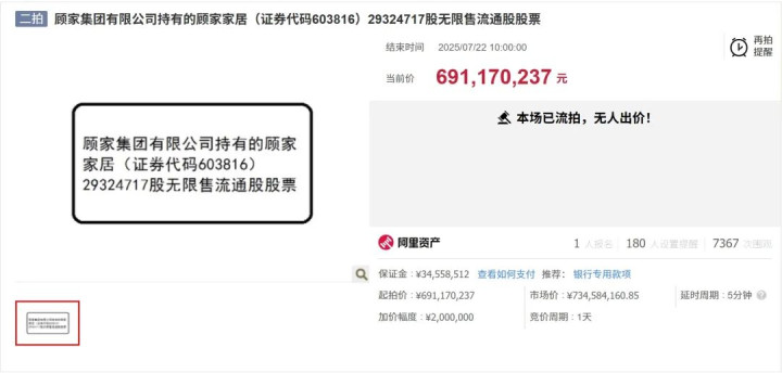 7月22日,顾家家居公告,原控股股东顾家集团持有的2932.47万股公司股票(占总股本3.57%)司法拍卖以流拍告终。此次拍卖由杭州中院执行,起拍价7.0458亿元。