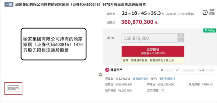阿里资产披露的竞买公告显示,浙江省杭州市中级人民法院将于8月19日10时至8月20日10时止(延时的除外)在杭州市中级人民法院淘宝网司法拍卖网络平台上公开拍卖顾家家居1470万股无限售流通股股票,起拍价为3.61亿元。